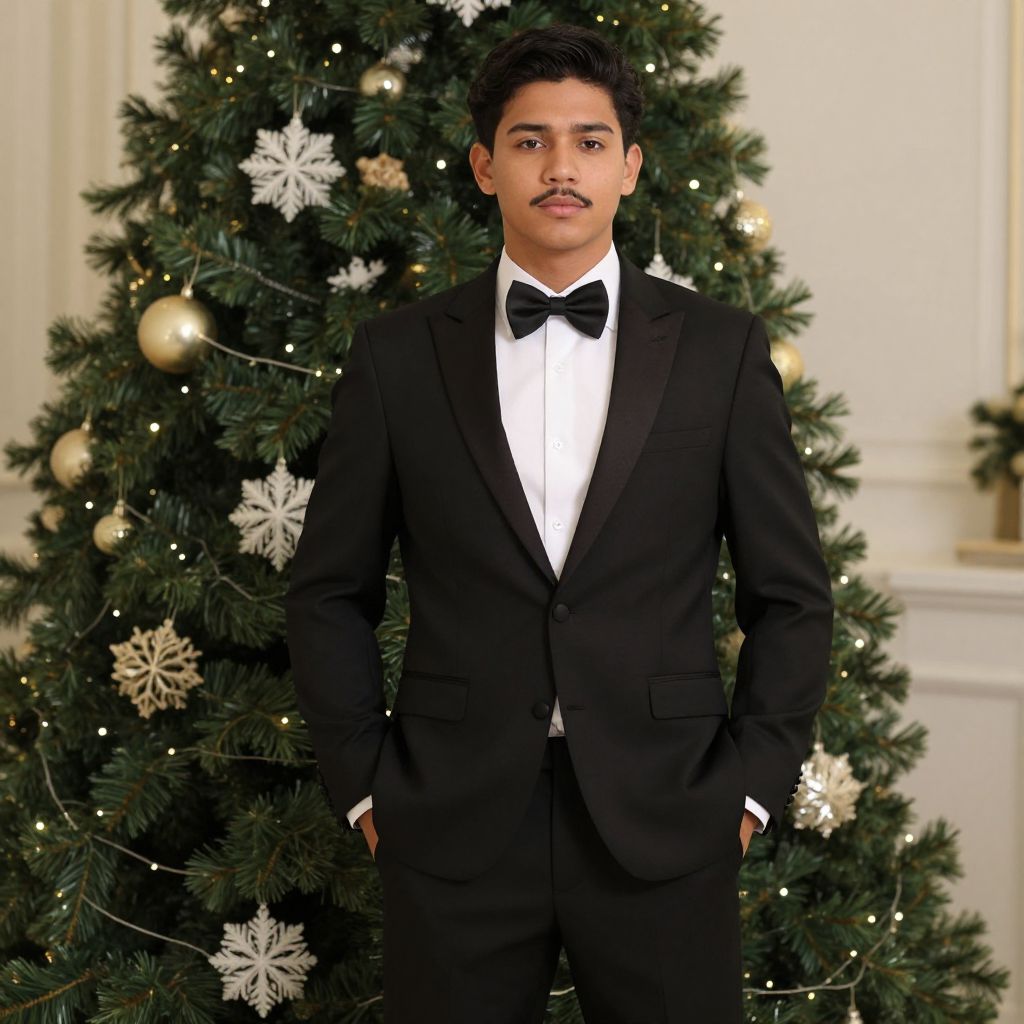 Photograph of a young man with medium brown skin and black hair, standing in front of a decorated Christmas tree. He wears a black tuxedo with a white dress shirt and black bow tie, with his hands in his pockets. The Christmas tree behind him is adorned with white snowflake ornaments, gold baubles, and string lights. The background features a white wall with decorative molding. The man has a mustache and a serious expression, and the image has a formal and festive atmosphere.