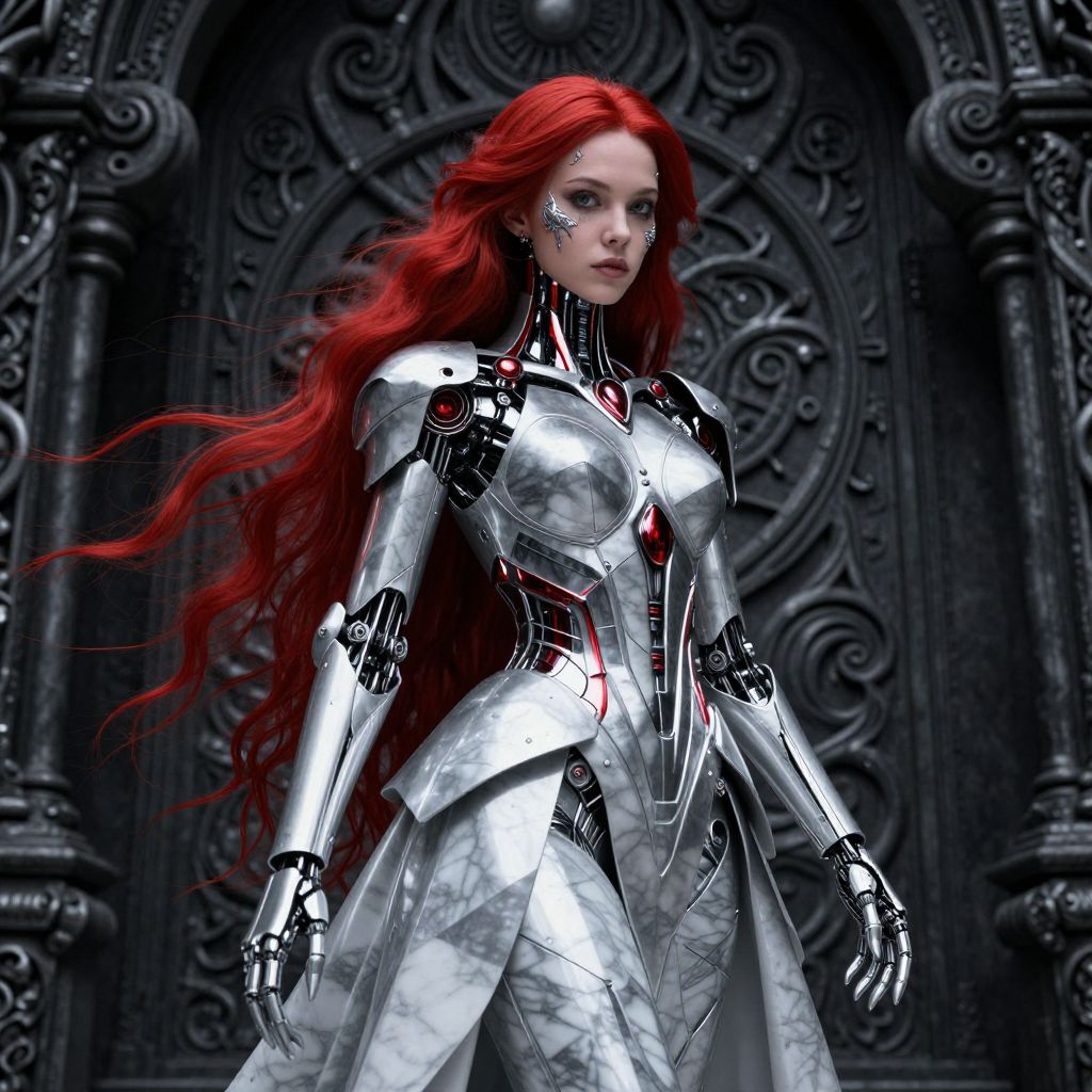 The image depicts a highly detailed and cybernetic woman, reminiscent of a futuristic, gothic style inspired by H.R. Giger. She stands in a dark, intricate environment, bathed in a moody, cinematic atmosphere with a touch of morning light filtering through. Her long, vibrant red hair cascades down her back, contrasting with her monochrome, silver latex and marble attire. The dress is a complex, faceted design with red metallic accents, evoking a sense of advanced technology and elegance. The woman's face is youthful, with a 16-year-old appearance, and she wears elaborate, silver face paint that adds to her otherworldly look. The background features ornate, mechanical elements and spiral patterns, enhancing the cybernetic theme. The overall composition is dynamic, with the woman positioned centrally, surrounded by the dark, detailed environment that frames her figure. The image is a blend of natural and mechanical elements, creating a visually striking and immersive scene.