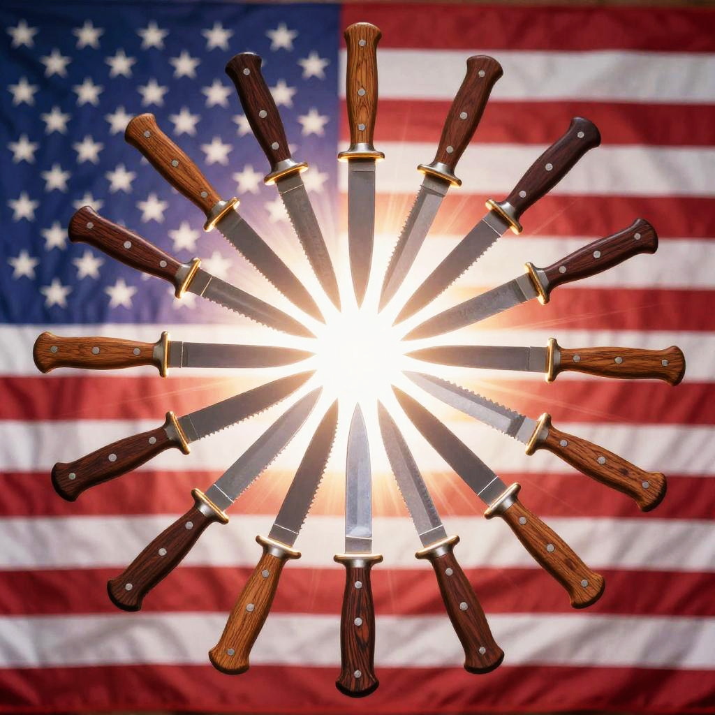 This image is a digital graphic featuring a large American flag in the background with a radiant, glowing effect. In front of the flag, there's a circular arrangement of various knives with wooden handles, pointing outward. The knives vary in size and design, with some showing a bit of wear. The overall vibe is patriotic and slightly intense, with the knives contrasting against the bright flag.