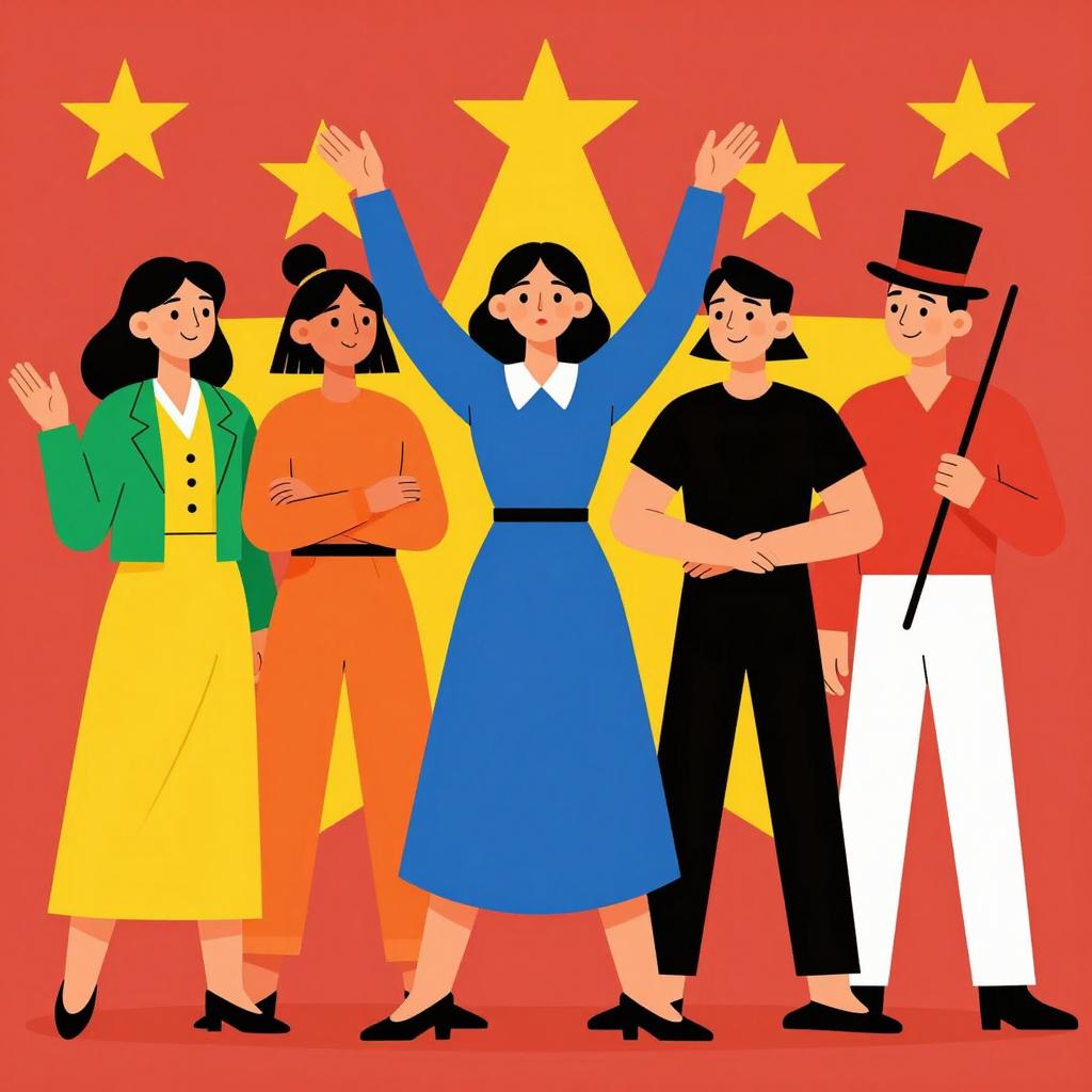 Six people in a colorful illustration. Red background with yellow stars. Central figure in blue, wide-sleeved dress, arms raised. To left, woman in green and yellow, gesturing. Next, woman in orange, arms crossed. Right, woman in black, holding man in black. Far right, man in red, white pants, top hat, holding stick. All standing, facing forward, various poses.