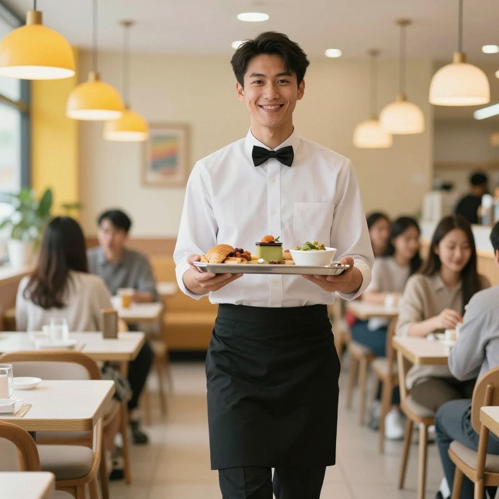 Waitstaff member with a friendly smile carrying a food tray through a bright, colorful dining hall, clean and inviting atmosphere, cinematic depth of field, highly detailed