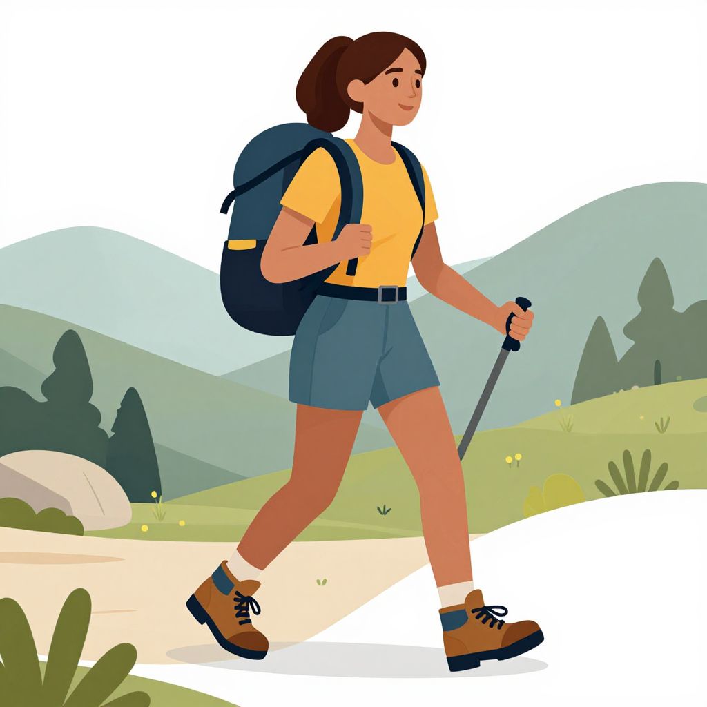 Cartoon illustration of a smiling woman with brown hair in a bun, white shirt, green shorts, brown boots, and a blue backpack, walking with