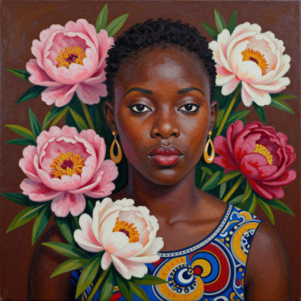 Photorealistic portrait of a dark-skinned woman with short curly hair, surrounded by pink and white peonies, looking directly at the viewer.