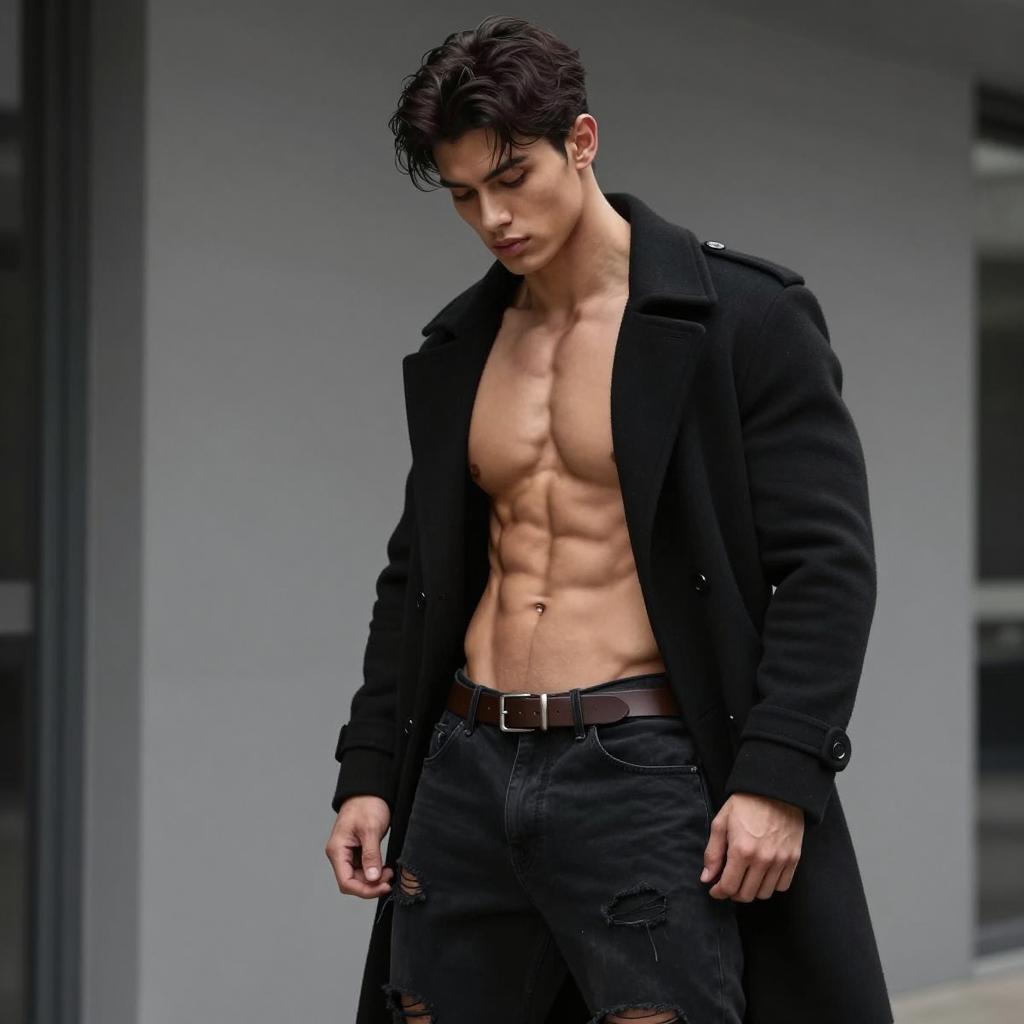 1boy, male focus, solo, pectorals, pants, open clothes, muscular, belt, black pants, facial hair, abs, torn clothes, muscular male, jacket, hands in pockets, black jacket, short hair, navel, torn pants, closed mouth, open jacket, black hair, chest hair, bara, large pectorals