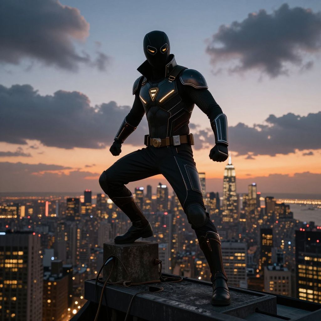 Photorealistic digital artwork of a masked, armored superhero standing on a rooftop at sunset, with a city skyline and illuminated buildings in the background.