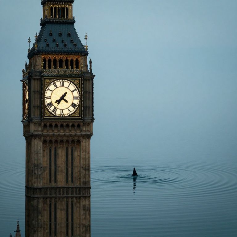 Photograph of London's Big Ben clock tower on the left, partially visible with its illuminated white clock face showing the time as 10:10. The tower is detailed with Gothic architecture, featuring ornate stonework and a dark, pointed roof. On the right, a small, dark silhouette of a bird is standing on calm, rippled water, which reflects a gradient of blue hues from the clear sky. The background is a smooth, light blue sky, creating a serene contrast with the detailed, dark structure of Big Ben. The overall mood is tranquil and slightly surreal.