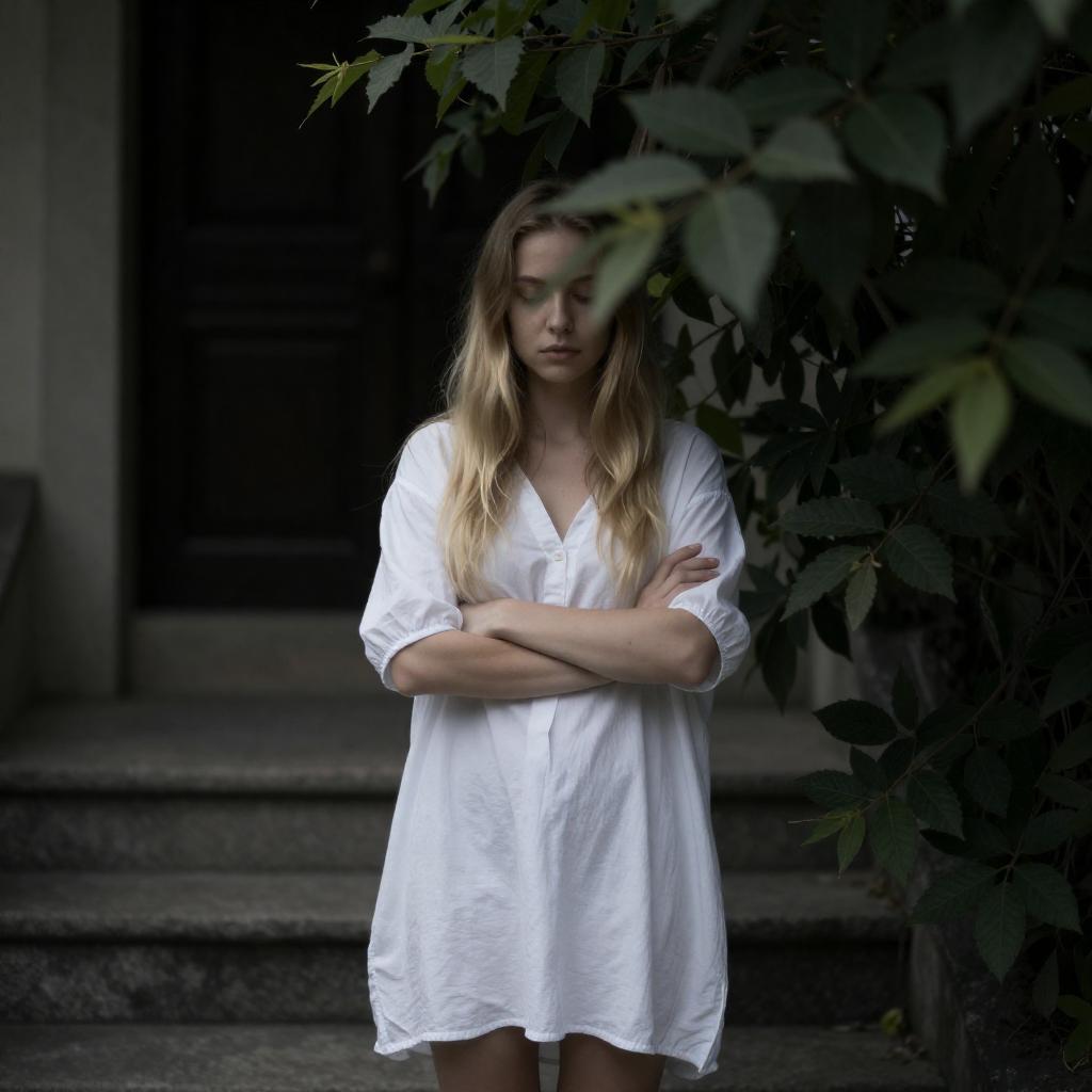 Woman with long blonde hair, wearing a loose white dress, standing with arms crossed, partially obscured by green foliage. Dark, shadowy background with stone steps and plant-covered walls. Moody, dimly lit scene.