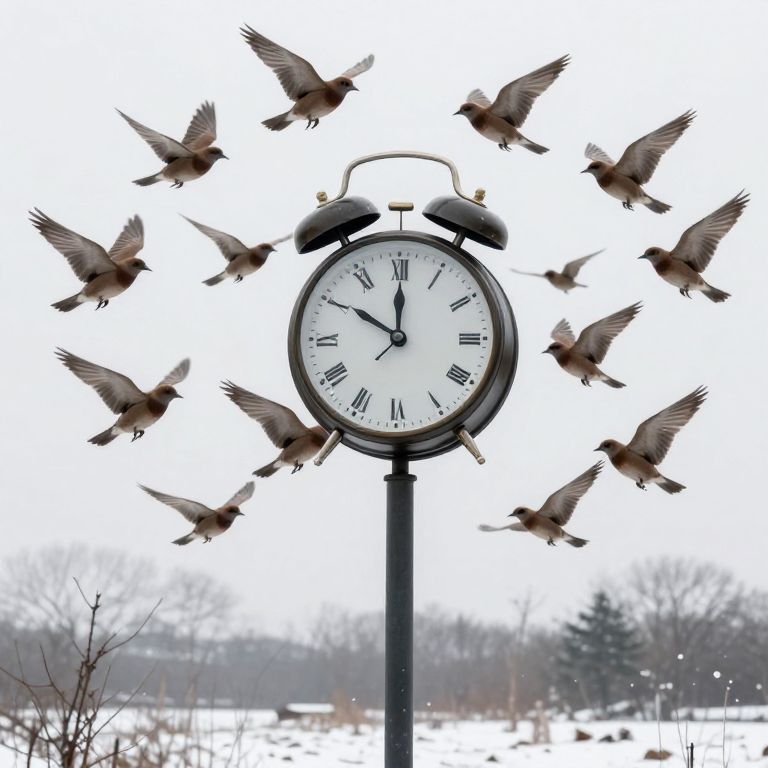 In a frost-kissed meadow where time and nature converge, clock-topped mushrooms stand sentinel, their chimes weaving a spell of serenity that momentarily halts the relentless march of time, offering a fleeting sanctuary of peace to the birds that perch upon them.