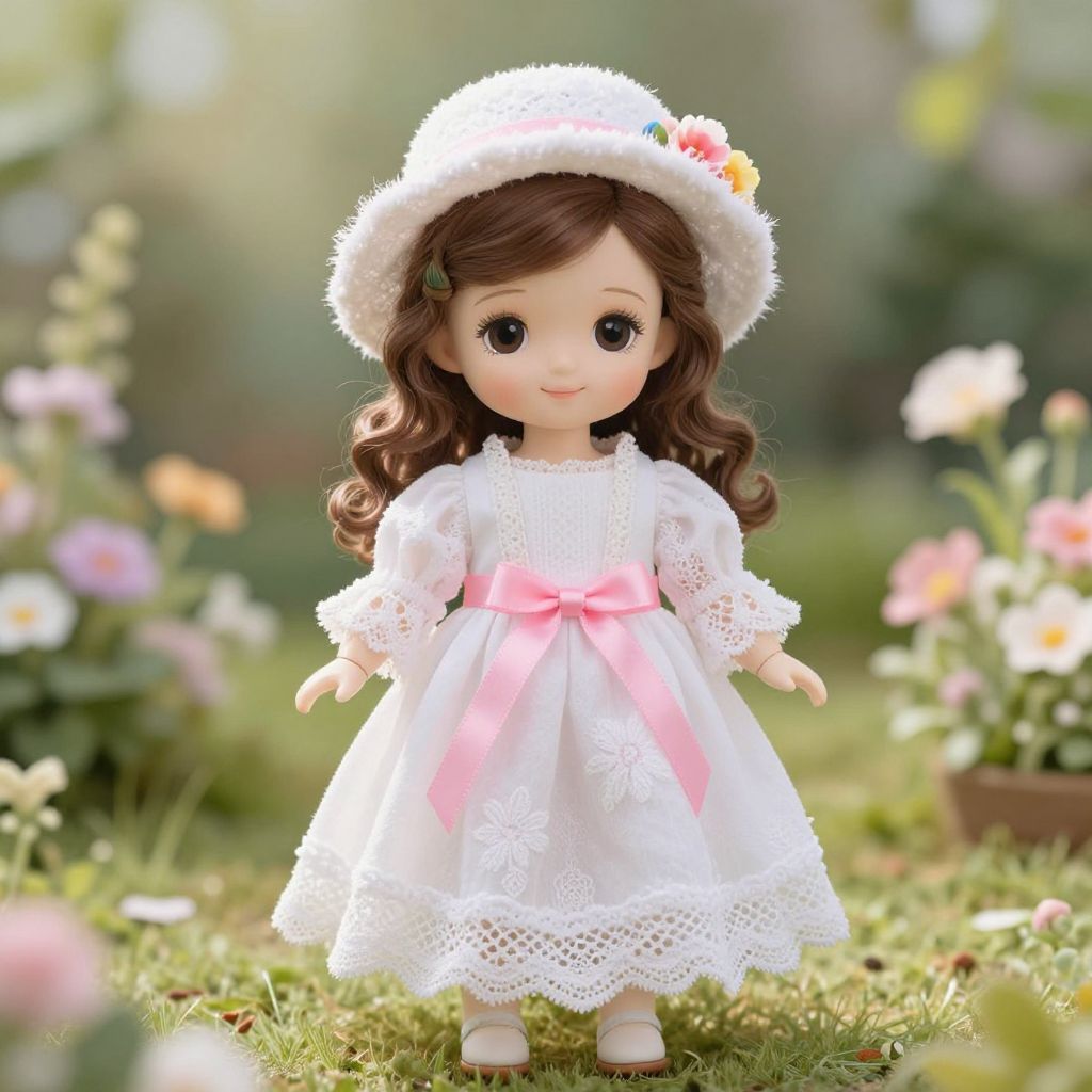 A cute female doll standing in a soft, sunlit garden, wearing a flowing white dress with delicate lace detailing, a bright pink ribbon tied neatly at the waist, and a fluffy white hat adorned with a small, colorful flower. Her large, expressive eyes are gently smiling, and her porcelain skin glows with a gentle warmth. The background features blooming flowers and soft green grass, creating a peaceful and whimsical atmosphere. The overall style is charming, nostalgic, and ideal for a fantasy or childhood-themed scene.