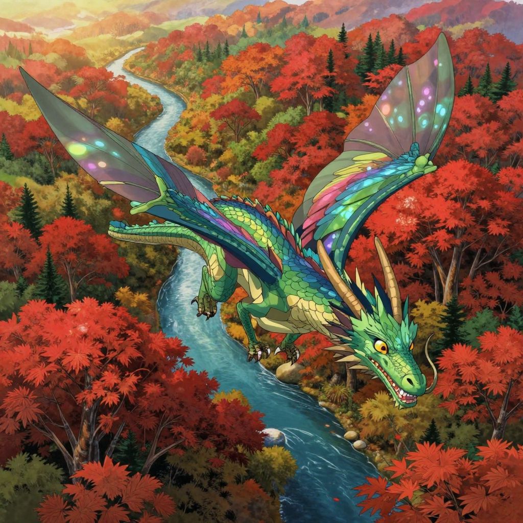 Visualize an enchanting digital artwork reminiscent of Studio Ghibli's whimsical world, portraying a majestic dragon soaring above a verdant, bioluminescent forest from a 'bird's-eye view'. The dragon's scales glisten with iridescent hues that reflect off the dewy treetops below. In the background, floating islands adorned with cascading waterfalls pour into shimmering pools, creating an atmosphere of serene wonder amidst the dragon's commanding presence. This breathtaking scene masterfully intertwines the raw power of mythical creatures with nature's splendor, painting a vivid image that effortlessly merges fantasy and reality while showcasing intricate details and emotional depth.
