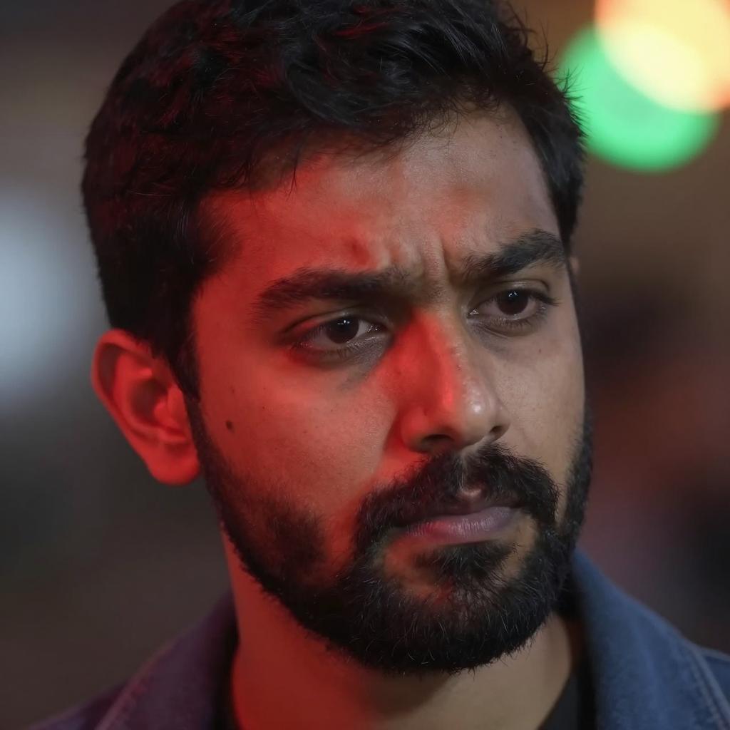 Close-up photograph of a man with a dark beard and mustache, short black hair, slightly furrowed brow, and a small mole on his right cheek. He has a blue shirt collar visible. The background is blurred with colorful bokeh lights in red, green, and yellow. The lighting is low and casts a red glow on his face. The man's expression is neutral and introspective.