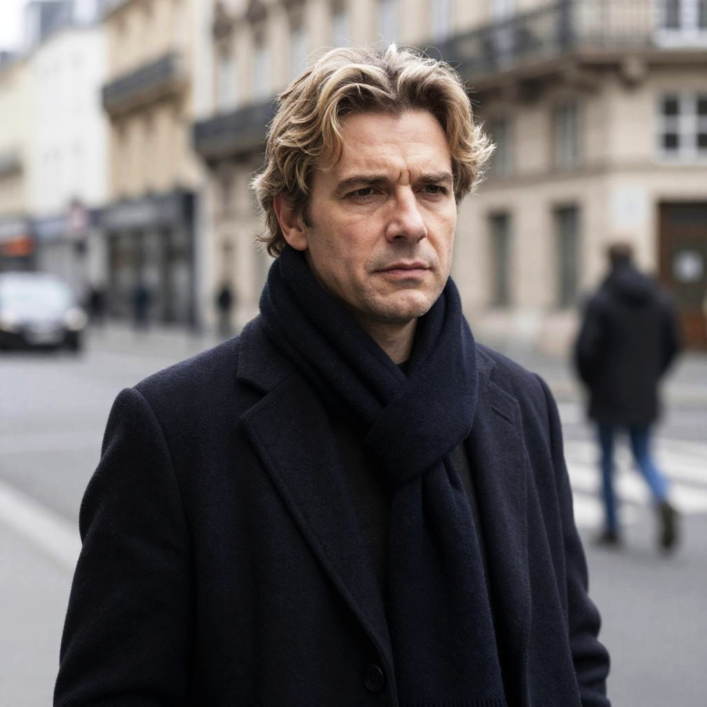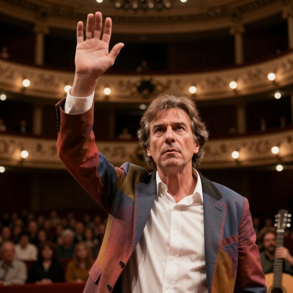Middle-aged man with brown hair, white shirt, and colorful jacket, raises his right hand in a theater. Background: dimly lit, multi-level, decorated with string lights. Crowd on lower level, partially visible. Guitar on the right. Intense facial expression.