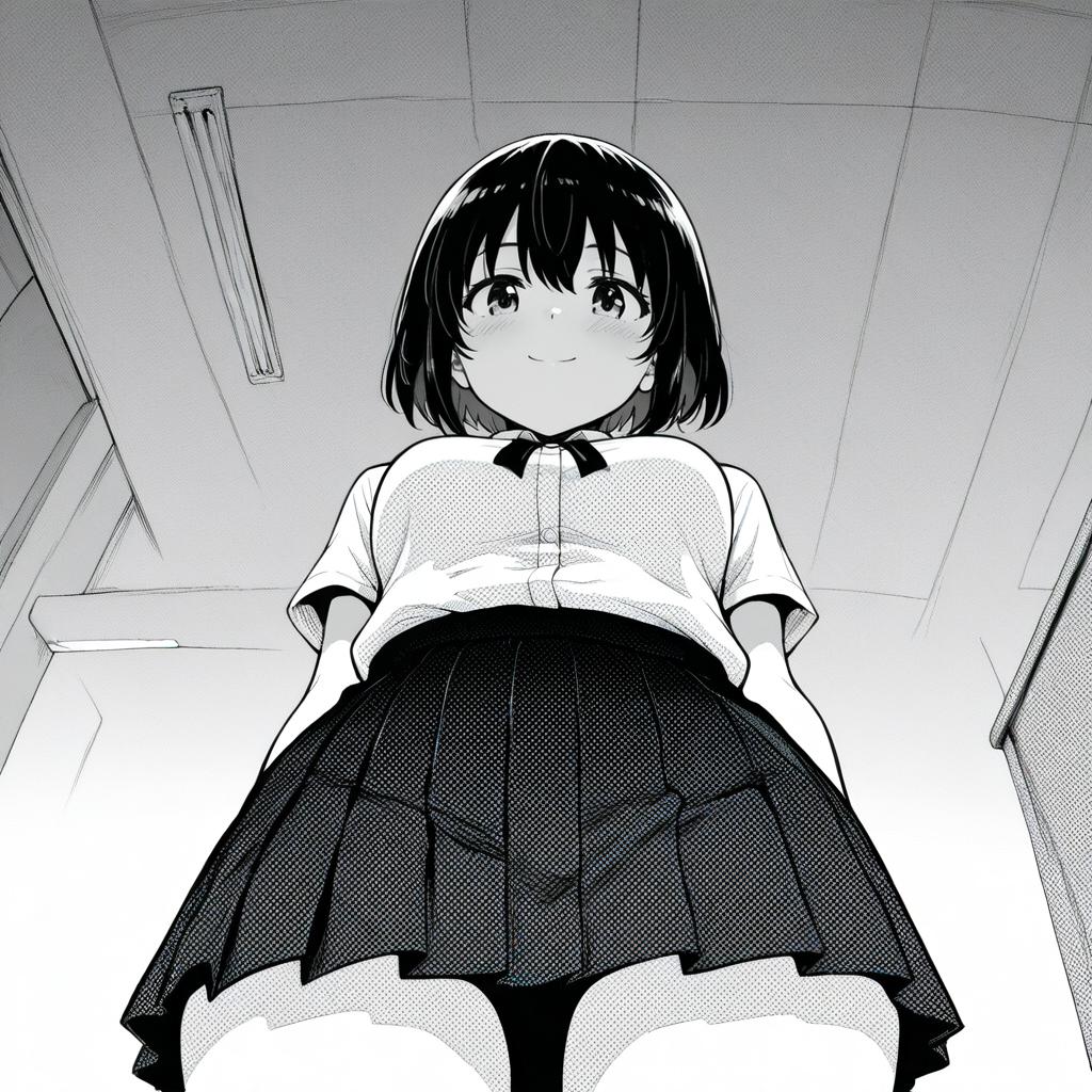 Masterpiece, 1girl, solo, pov, ayase fuuka, school uniform, blouse, pleated skirt, ribbon, mini skirt, from below, cowboy shot, smile, greyscale, monochrome, halftone, drawing, manga, otoyomegatari, face focus, class room