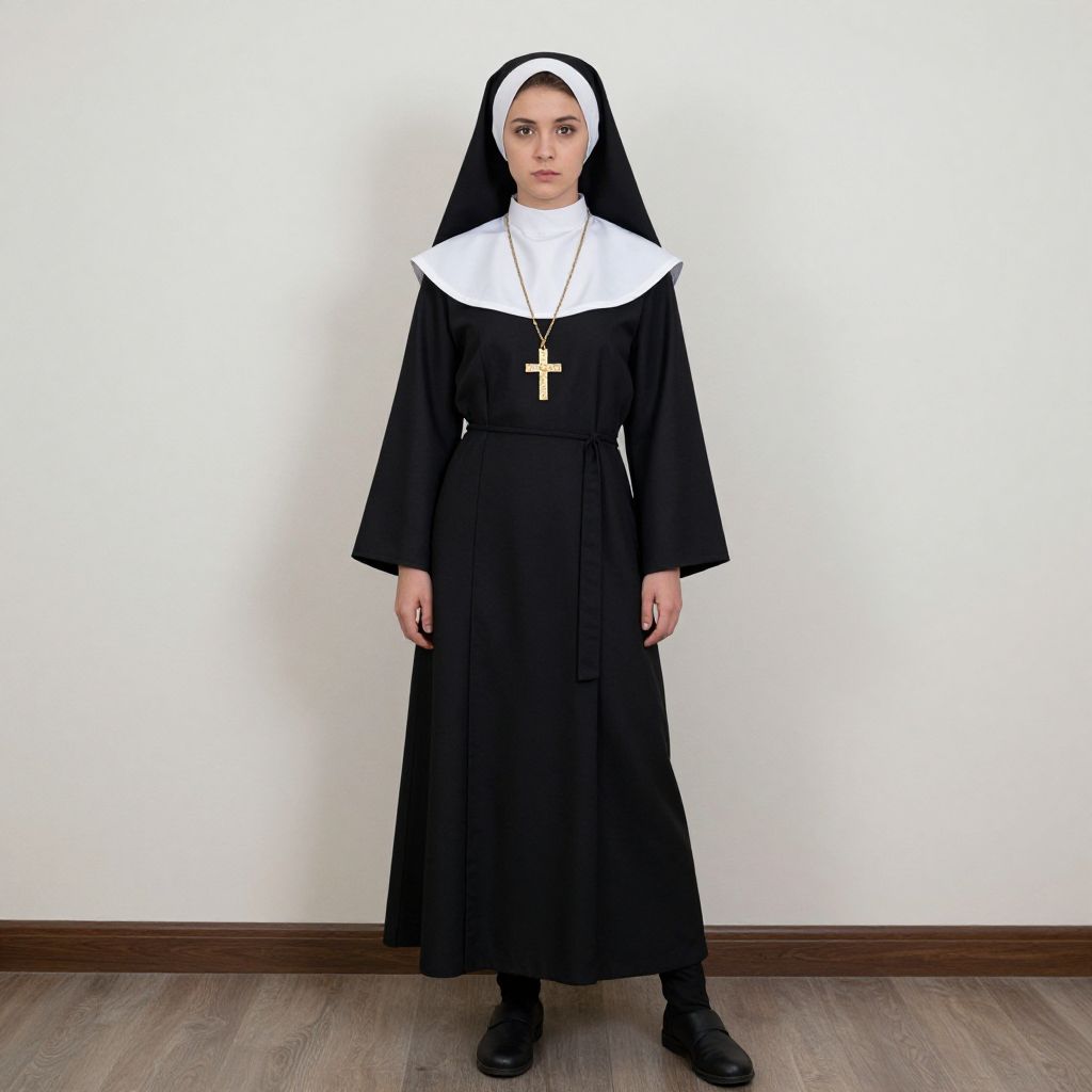 "nun woman costume, solo, cross, male focus, 1boy, nun, jewelry, necklace, habit, cross necklace, realistic, standing, full body, parody, priest, traditional nun, cosplay Realistic photo of casual sexy person with pretty face"