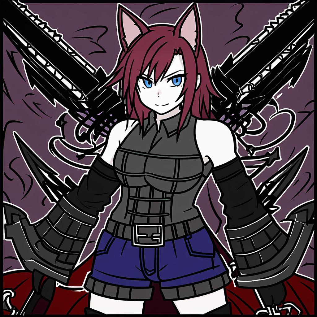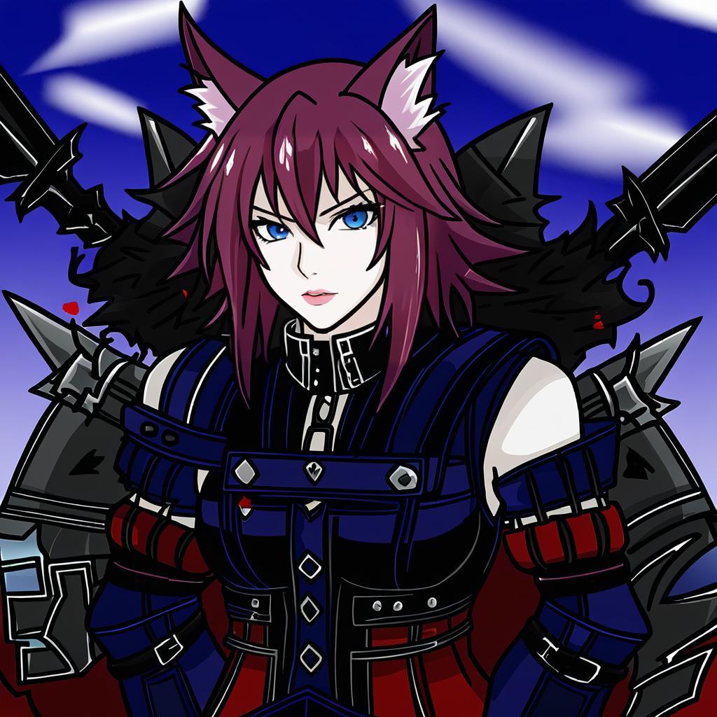 Digital anime-style illustration of a female character with cat ears, purple hair, and blue eyes, dressed in intricate dark blue and black armor with red accents. She is depicted with multiple weapon-like elements in the background, inspired by Final Fantasy VII character Cait Sith.