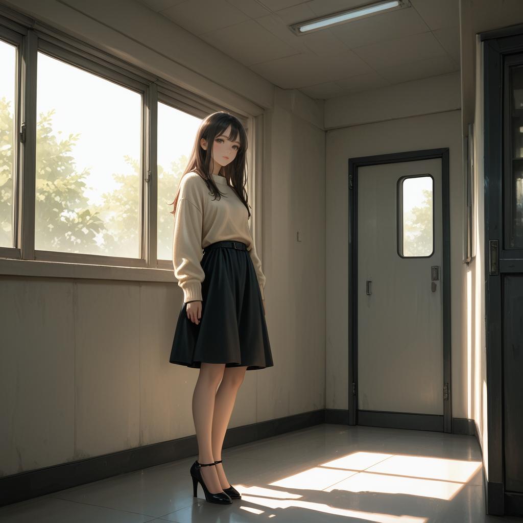 Photorealistic full-body image of an Asian woman with long brown hair and brown eyes standing indoors near a window. She is wearing a grey, knee-length dress with long puffed sleeves and a cinched waist tied with a bow. She has on high-heeled silver sandals. Soft sunlight filters through the window, casting shadows around her. The setting is minimalistic and calm, emphasizing the subject's serene expression with closed lips and relaxed posture.