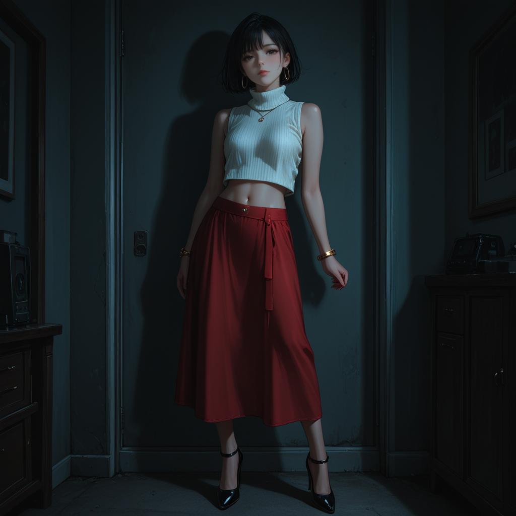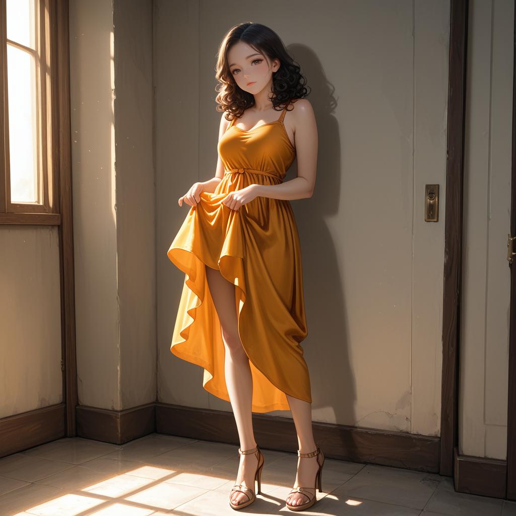 1girl, shadow, solo, dress, long hair, realistic, standing, high heels, asian, full body, white dress, black hair, looking at viewer, brown hair, sunlight, photorealistic, lips, indoors, sandals, grey dress, arms at sides, brown eyes, window shade, k-pop, closed mouth