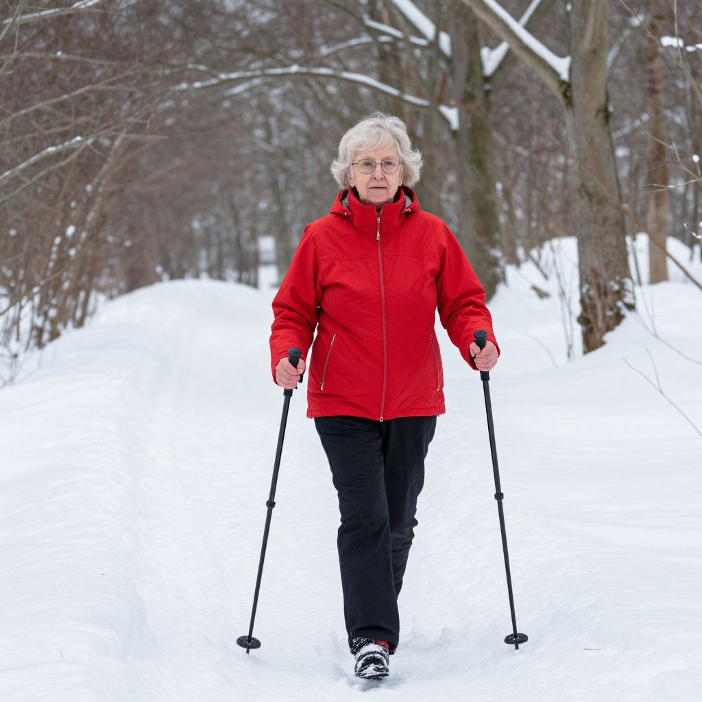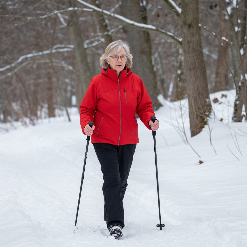 Senior woman enjoying a brisk winter walk through a snowy forest, dressed in a vibrant red jacket and black pants, using two black trekking poles to navigate the snow-covered path.