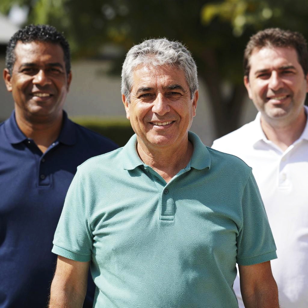 Photograph of three men smiling outdoors. The man in the center, with short gray hair and a medium build, wears a teal polo shirt. He's slightly in focus, with two men on either side blurred. One man on the left has dark skin and short curly hair, wearing a blue shirt, and the man on the right has lighter skin and short hair, wearing a white shirt. Background shows bright sunlight and green foliage.