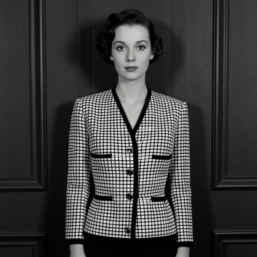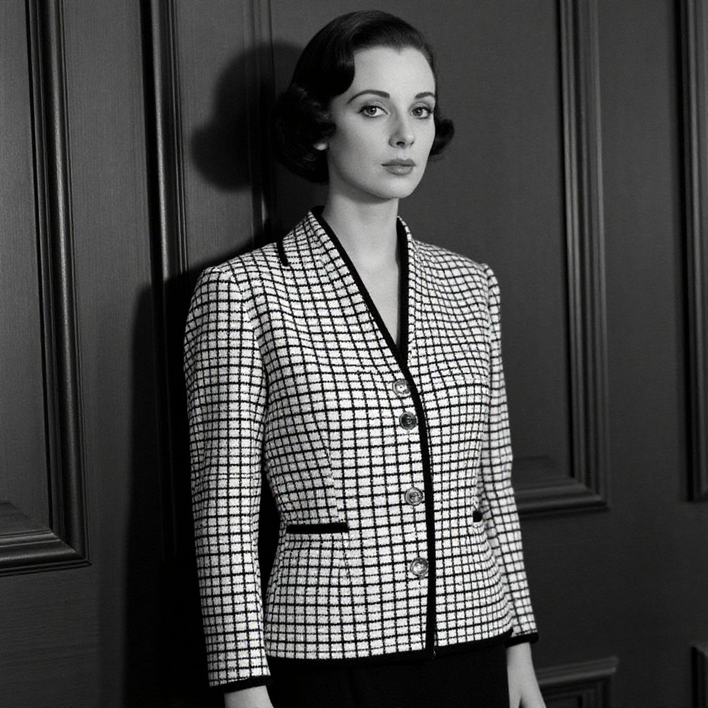 Black-and-white photograph of a poised woman with fair skin and dark, wavy hair styled in an elegant 1940s updo. She wears a checkered, black-and-white, long-sleeved jacket with a black collar and buttons, standing against a dark, paneled door. Her expression is calm and confident. The high-contrast lighting emphasizes the grid pattern of her jacket, creating a vintage, classic look. The texture of the door panels is visible in the background, adding depth to the image.