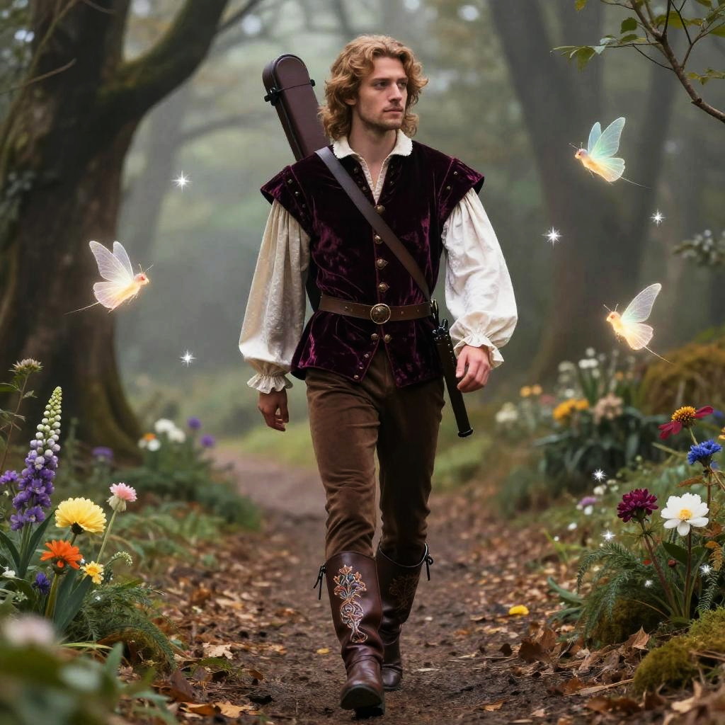 Bard clothes DnD, romantic Renaissance-inspired outfit with velvet doublet, silk shirt with puffed sleeves, embroidered leather boots, musical instrument case strapped on back, walking through misty forest path with enchanted flowers and sparkling fairies.