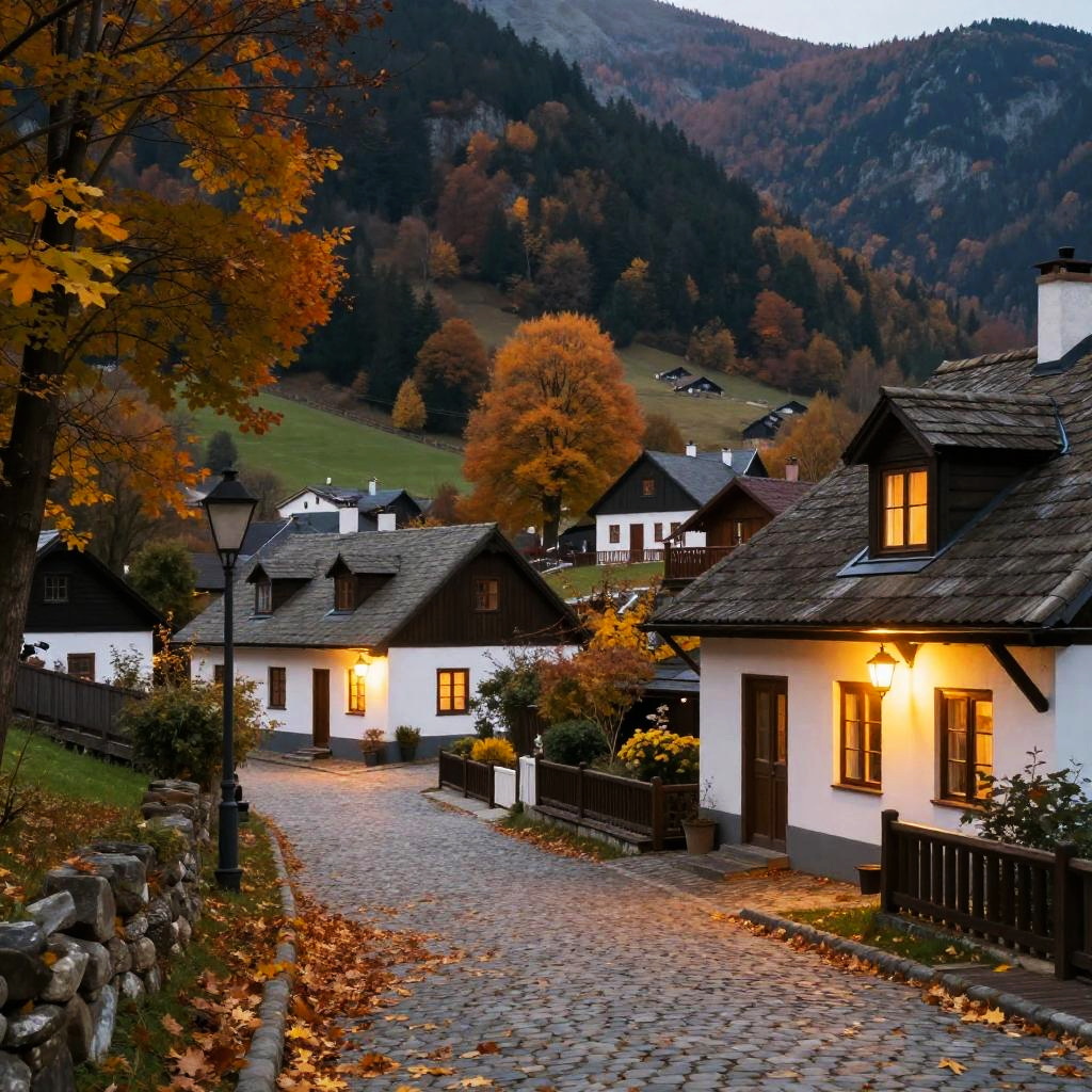 Smedan cozy quaint village set in a mountainous landscape during autumn, warm lights glowing from rustic cottages, colorful fallen leaves scattered on cobblestone streets, peaceful and nostalgic mood, detailed architecture and natural elements