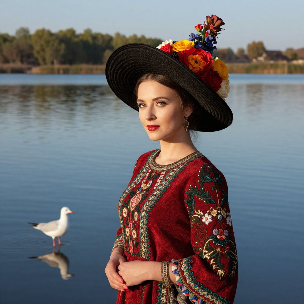 Elegant portrait of a woman adorned in traditional Russian attire, featuring a wide-brimmed hat decorated with vibrant flowers and a richly embroidered red gown, set against a serene backdrop of a calm lake and a seagull perched gracefully on the water's surface.