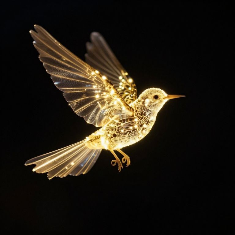 Glowing bird soars gracefully through the night, its translucent wings and tail adorned with shimmering golden lights that trace ethereal patterns against the dark backdrop.