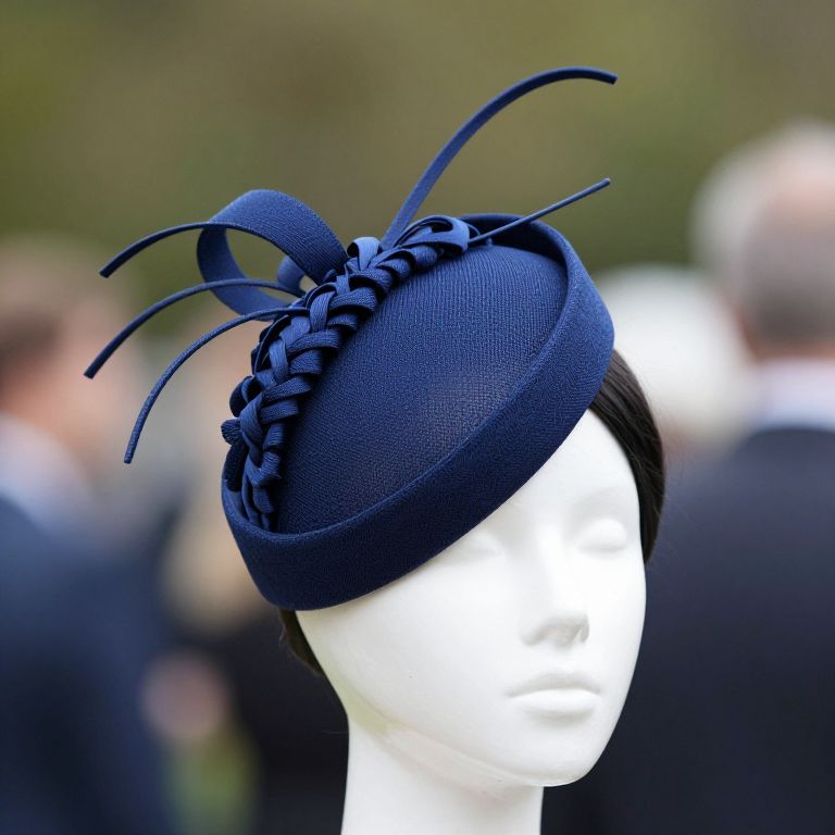 Mannequin head showcasing a navy royal blue pillbox hat adorned with a hair fascinator featuring intricate braided details and loops, styled as a statement accessory for races or cocktail events.