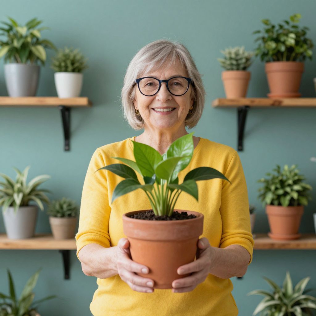 Photograph of an elderly woman with short gray hair, black glasses, and a yellow sweater, smiling while holding a potted plant against a teal wall