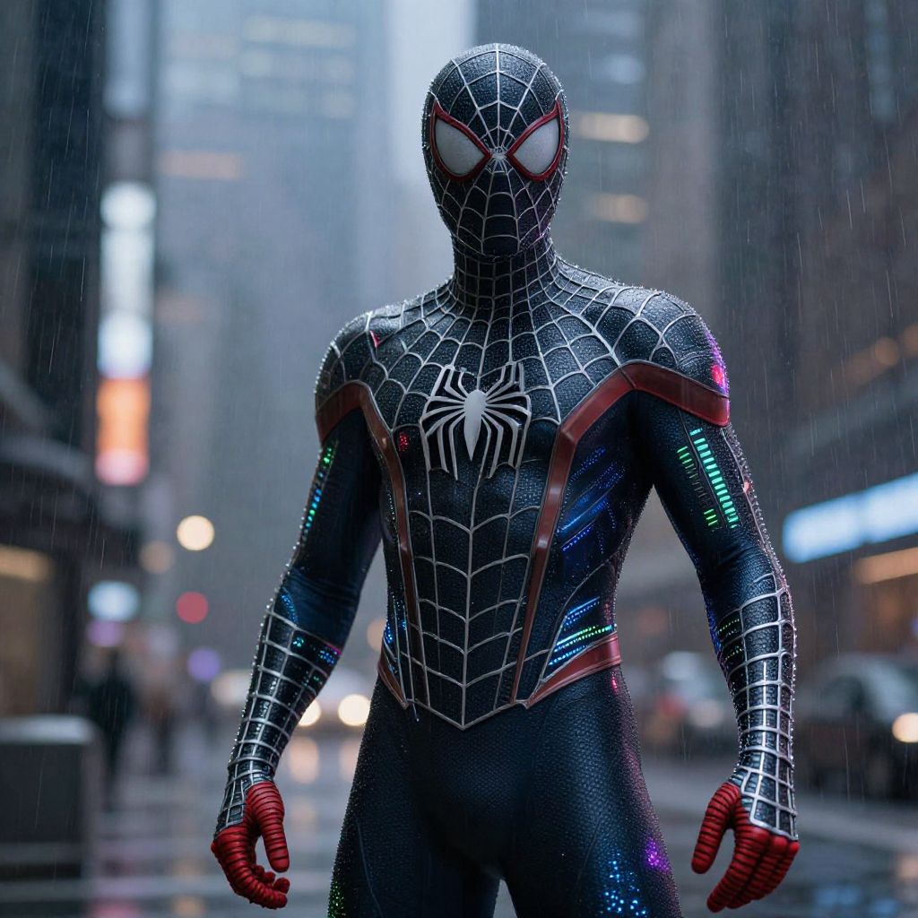 Digital artwork of Spider-Man in a red, web-patterned suit with white eyes, surrounded by colorful geometric shapes, against a neon-lit cityscape