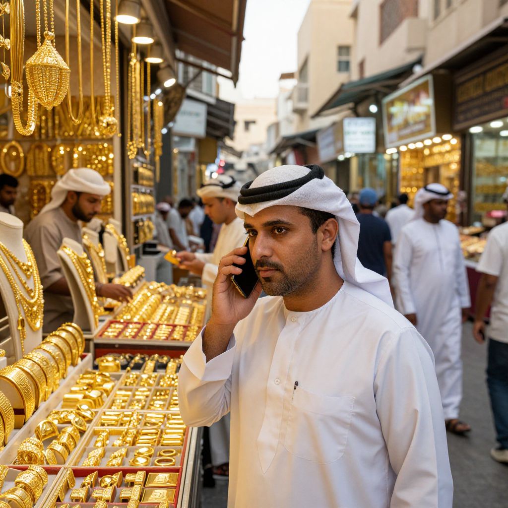 Photograph of a Middle Eastern man in a white thobe and kufi, talking on his phone, standing in a bustling gold market with numerous