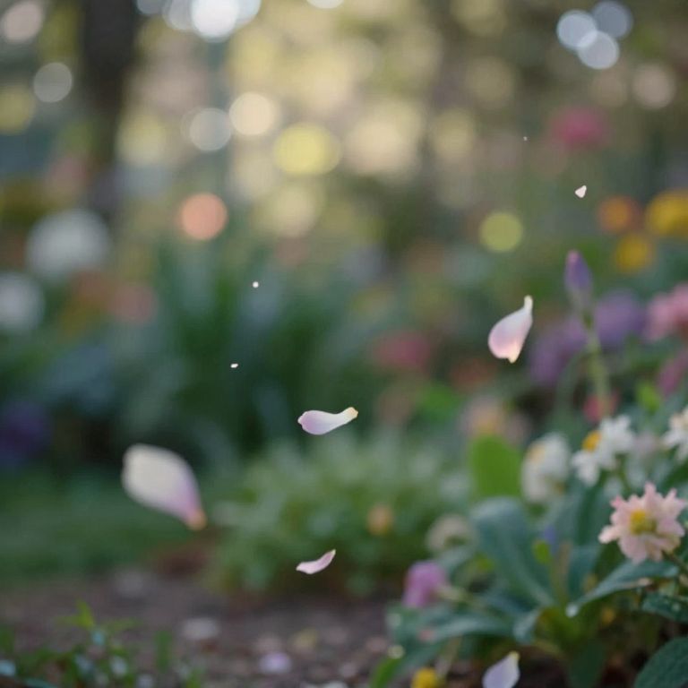 Imagine an enchanting garden scene captured from an intimate 'bug's-eye view', reminiscent of impressionist techniques. Delicate petals dance in soft waves, stirred by a gentle breeze, against an abstract backdrop of dappled sunlight and muted colors. This unique perspective showcases nature's intricate details, evoking both tranquility and curiosity as viewers explore this dreamlike microcosm.