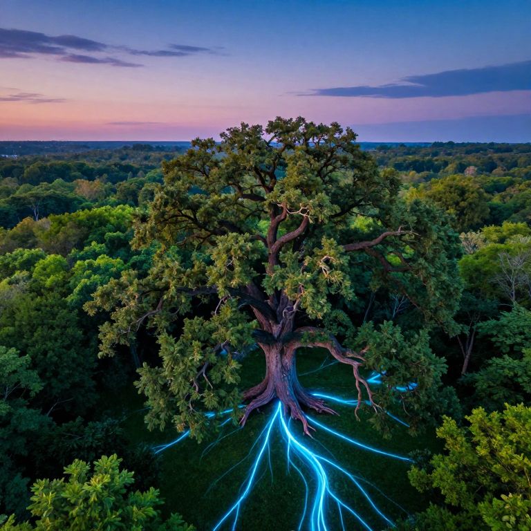 A captivating digital art piece captures the essence of dreamlike landscapes by masterfully blending vibrant colors with the tranquility and mystery of nature. From an aerial perspective, reminiscent of a tiny flying creature's viewpoint, this surreal scene unveils a lush green forest bathed in twilight hues. An ancient oak tree dominates the foreground, its twisted branches reaching towards a mesmerizing sky where they intertwine with glowing, neon-blue energy lines that trace their path underground. This visual symphony creates an atmosphere of wonder and awe, inviting the viewer to delve deeper into the enchanting world where nature's beauty and mystery seamlessly merge.