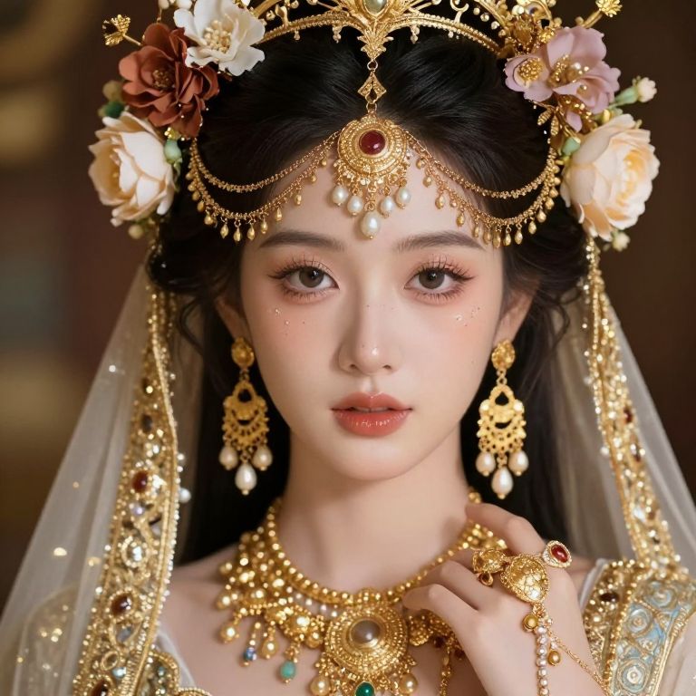 A person adorned in intricate, golden jewelry and floral headpiece, exuding an ethereal and regal presence.