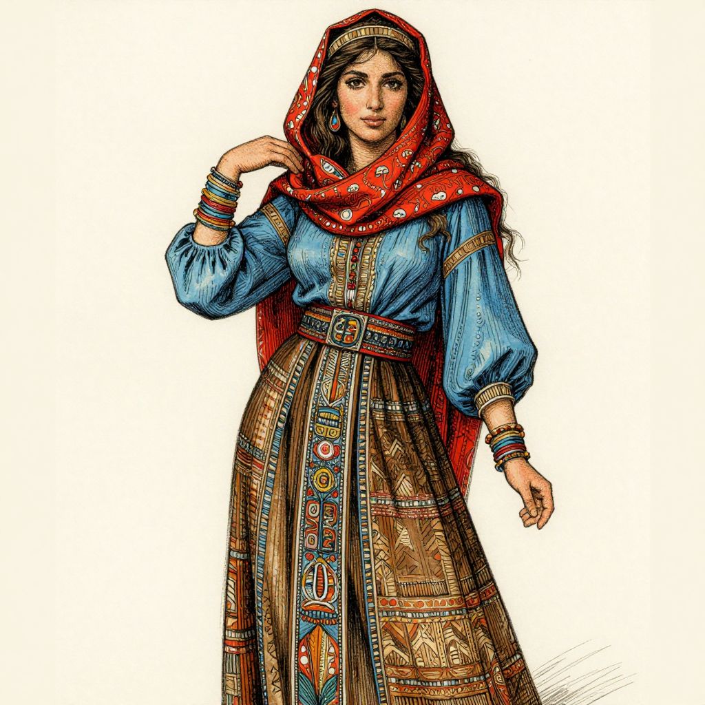 The image is a detailed ink and brush drawing of a woman dressed in vibrant, intricate clothing that evokes a sense of ancient Mesopotamian culture. She wears a richly patterned red scarf wrapped around her head, which cascades down her shoulders, complemented by a blue blouse with puffed sleeves. Over the blouse, she dons a long, layered skirt in shades of brown and beige, adorned with intricate patterns and textures. Her attire is accessorized with numerous bracelets and a belt, both featuring elaborate designs. The woman's long, wavy hair flows freely, adding to the dynamic and lively nature of the drawing. The overall composition is rich with color and texture, creating a visually striking and historically evocative scene. The style of the artwork is reminiscent of Arthur Rackham's detailed and imaginative illustrations, capturing the essence of a bygone era with a modern artistic flair.