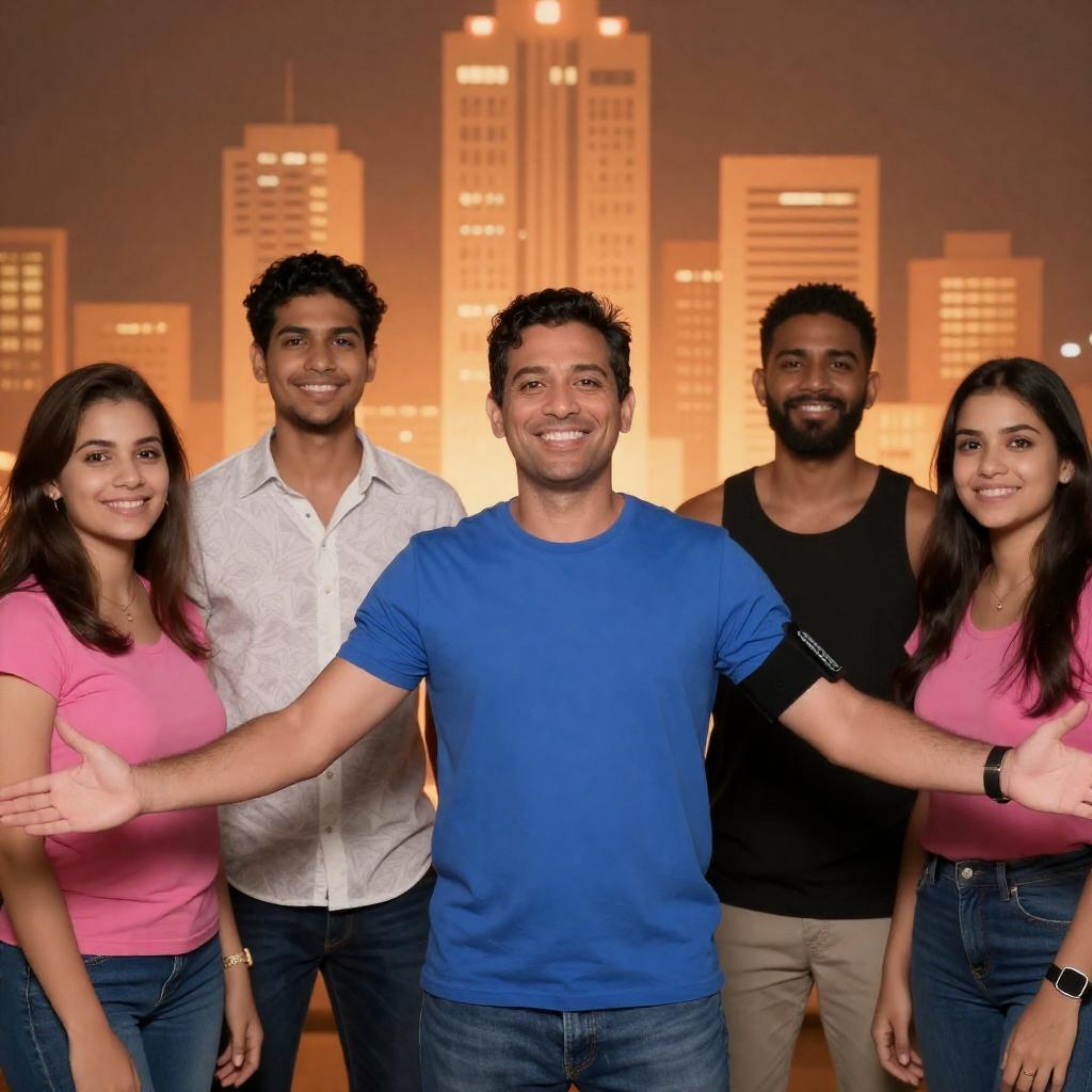 Photograph of six people in front of a glowing orange cityscape. Center man with blue shirt and black arm band, smiling, arms outstretched. Two women on left and right in pink tops, one man in white patterned shirt, one man in black tank top, all smiling. Warm light illuminates background.