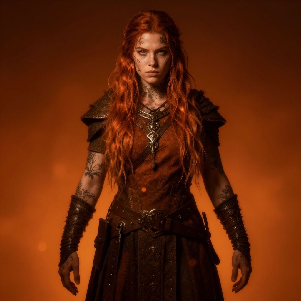 Photograph of a fierce, red-haired woman with long, wavy hair standing against a fiery orange background. She has a stern expression and is dressed in dark, medieval-style armor with intricate patterns on her chest, arms, and skirt. Her arms are adorned with black, leather bracers. Her skin is lightly freckled, and she has tribal tattoos on her left arm. The lighting creates dramatic shadows, enhancing the intensity of the scene. The overall style evokes a fantasy or warrior-like character.