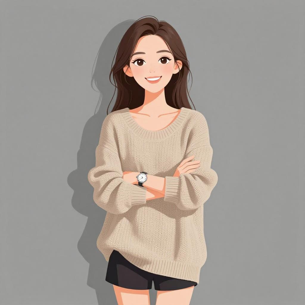 Woman with pretty face and pretty hair. smiling Woman, casual chic, oversized knit sweater in a light beige color, scoop neck, drop shoulder, long sleeves, black shorts barely visible, silver wristwatch, standing pose with arms crossed, solid grey studio background --sref 1467
