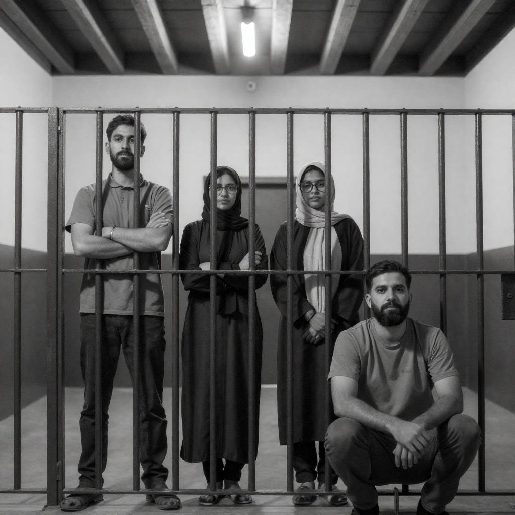 Black-and-white photograph of four people in a prison-like setting. Two men and two women stand and sit in front of metal bars. The man on the right, with a beard, sits with crossed legs, while the others stand with arms crossed. The ceiling has slanted wooden beams. The woman in the center wears glasses and a headscarf.