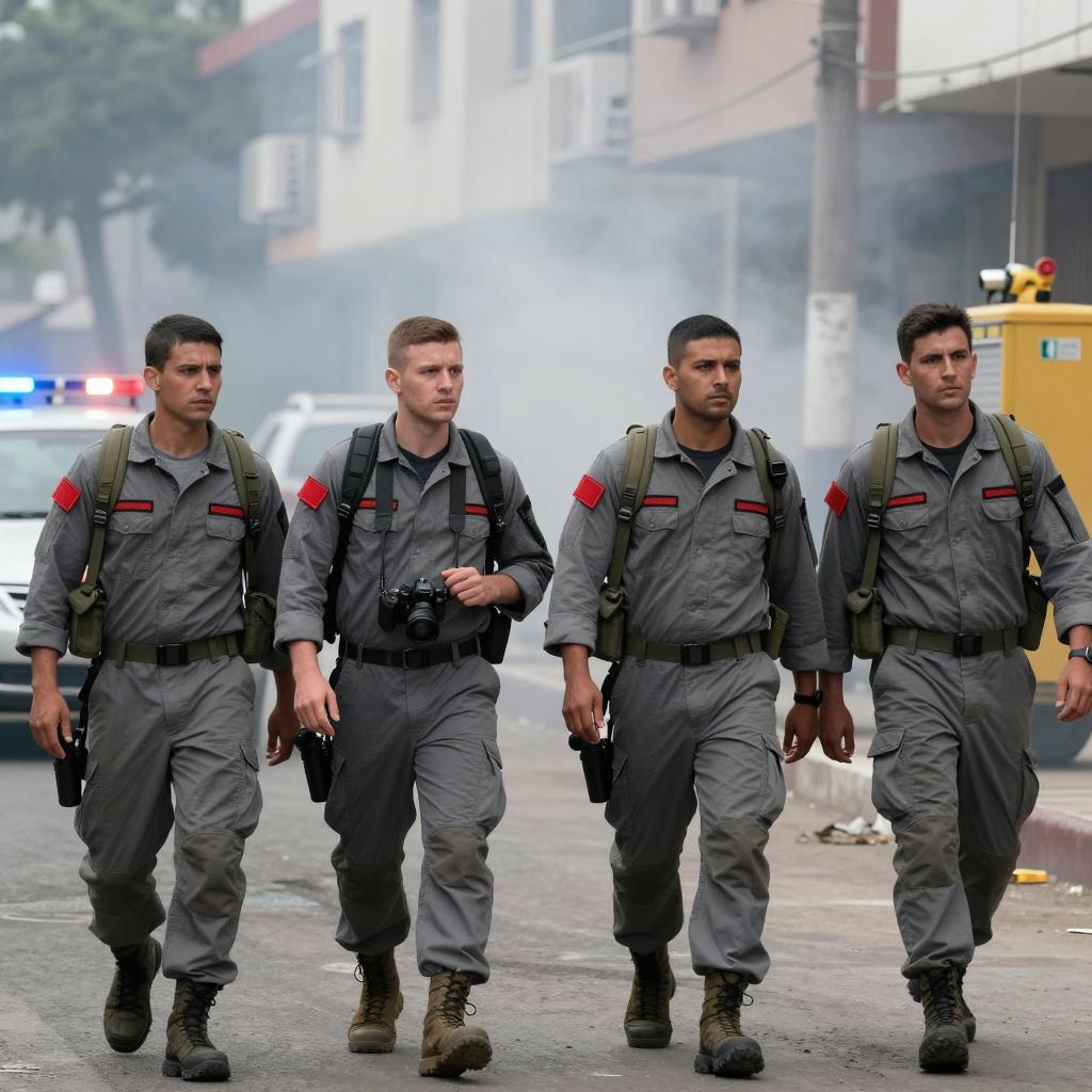 Photograph of a group of six men in a hallway. Central figure is a uniformed soldier with a hat, holding a rifle, wearing dark pants, and medals. Five bald men in white t-shirts and shorts stand behind him, each holding a rifle and covering their genitals. Hallway has green walls, fluorescent lights, and red flooring. Soldier has a stern expression. Men in white have neutral expressions.