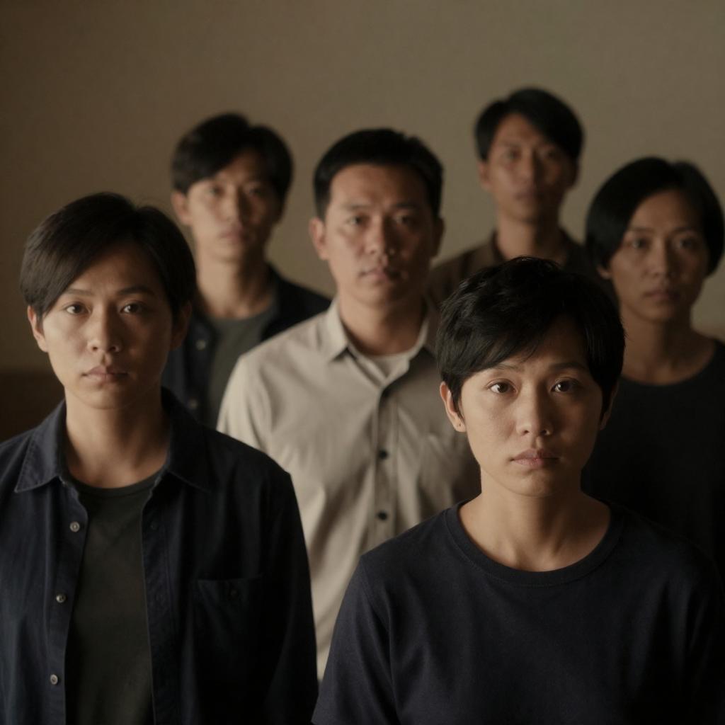 Photograph of five Asian individuals with short black hair, wearing dark and light-colored clothing, standing closely together in a dimly lit room. The foreground subject, slightly to the right, gazes forward with a neutral expression. Background subjects are softly illuminated, creating a warm, intimate atmosphere.