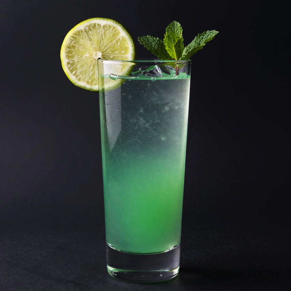 Photograph of a clear, tall glass filled with water and a bright green liquid, possibly a cocktail. A lime slice and a sprig of fresh mint sit on top. The glass is slightly tilted, with light reflecting off the green liquid and creating a vivid, glowing effect. The background is solid black, making the glass and its contents stand out sharply.