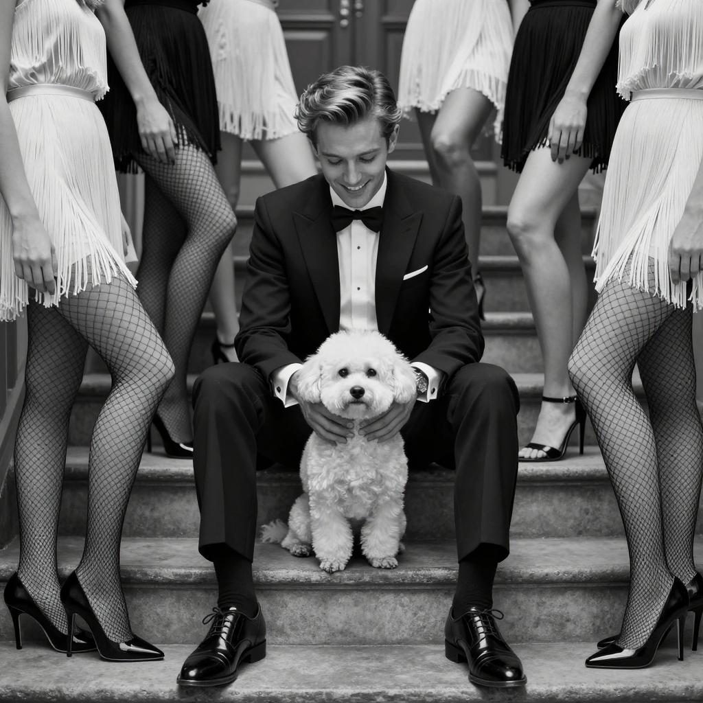 Black and white photograph. Male in black tuxedo, bow tie, sitting on stairs, looking down, smiling, with small fluffy white dog beside him. Surrounding him, multiple women in fringed dresses, fishnet stockings, high heels, legs visible. Women's legs form semi-circle around him. Dog looks up at him.
