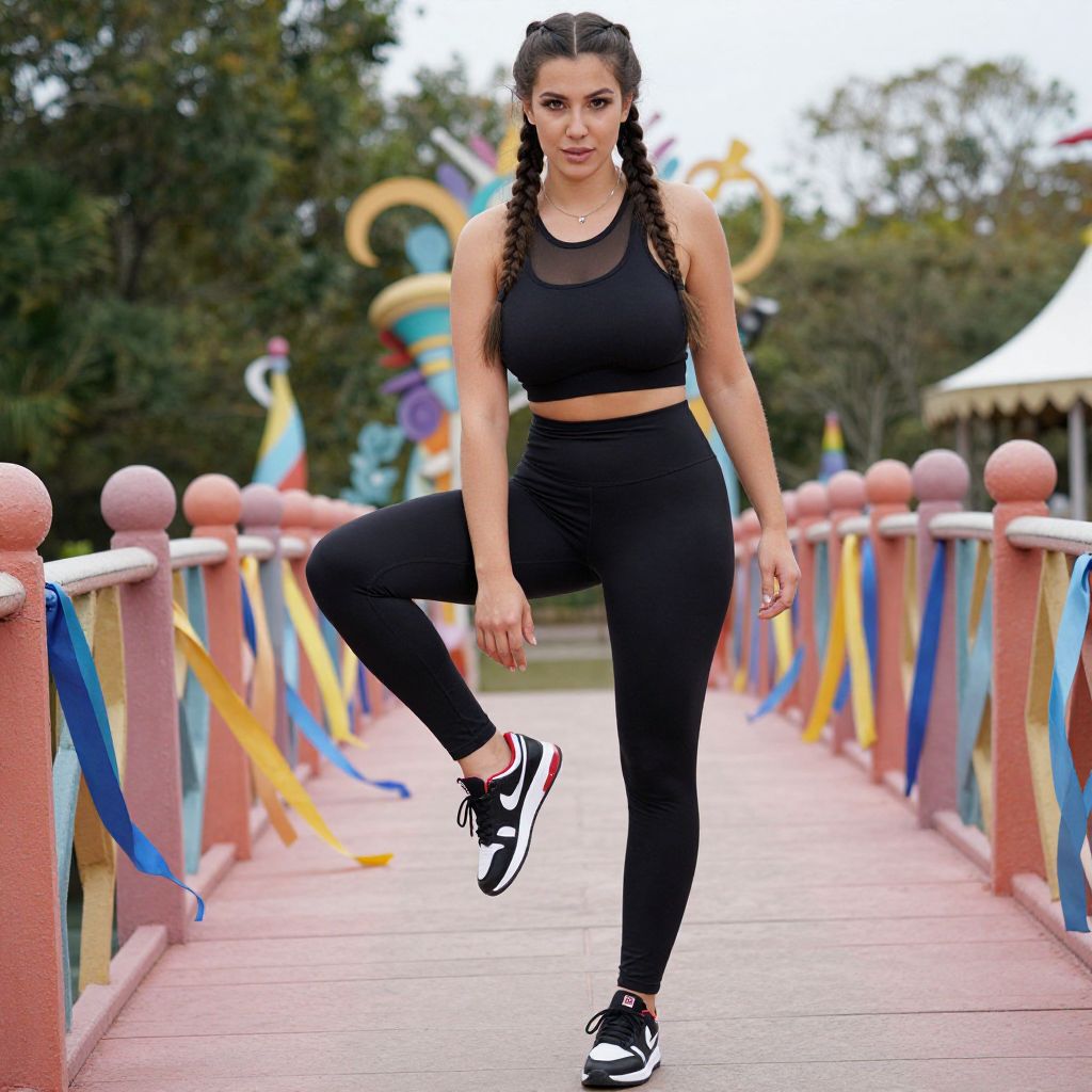 A tall woman, pinhole camera style, in sporty athleisure: black crop top with mesh detail, high-waisted black leggings, black sports shoes with white and red accents, hair in long braids, standing on a Wonderland bridge with flowing ribbons, adjusting her shoes. Sexy. Pretty face and beаutiful eyes. Big breasts