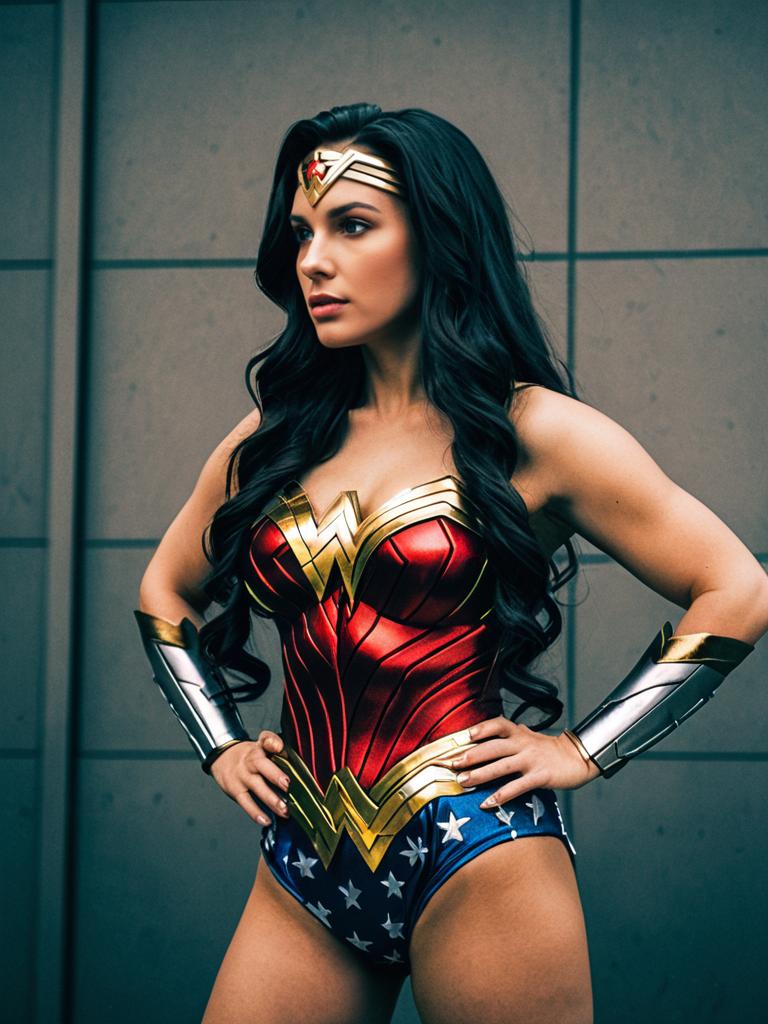 Photograph of a woman with long, wavy black hair, wearing a tight, red, gold-trimmed Wonder Woman costume with a star-spangled blue belt and gold arm bracelets. She has a golden tiara with a white star on her forehead and a stern expression. The costume highlights her toned physique and medium-sized breasts. The background is a plain, dark gray. The lighting is dramatic, emphasizing her figure and the vibrant colors of her outfit. The image has a slightly stylized, high-contrast effect, enhancing the visual impact.