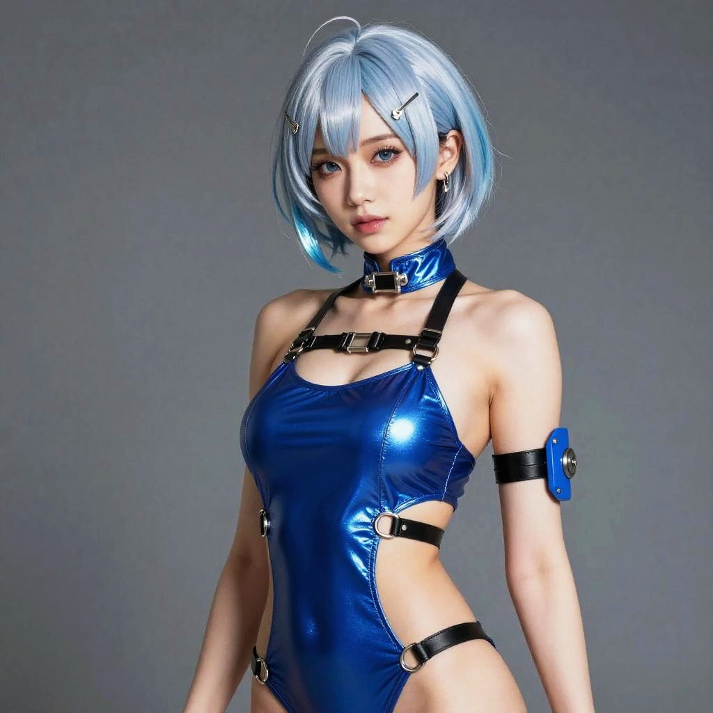 CGI image of a young woman with silver-blue bob haircut, wearing a shiny blue leather harness bodysuit, black straps, and blue armb