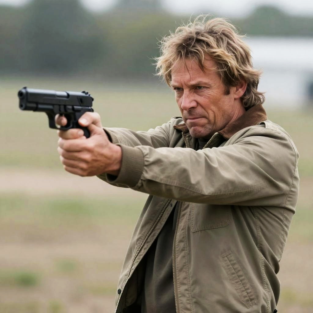 Middle-aged man with short blond hair, crouching, holding a black rifle, wearing a brown jacket and brown pants. Background includes wooden crates and a dirt ground with trees. Intense side profile. Forest setting. Movie still.