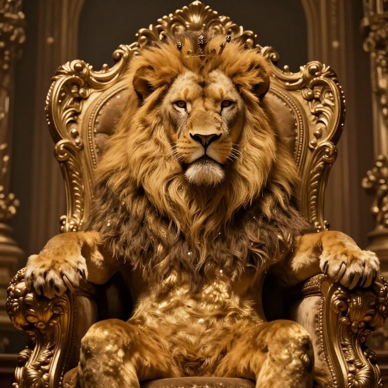 Digital artwork of a regal golden lion sitting on an ornate, baroque throne, exuding power and majesty with intense gaze.