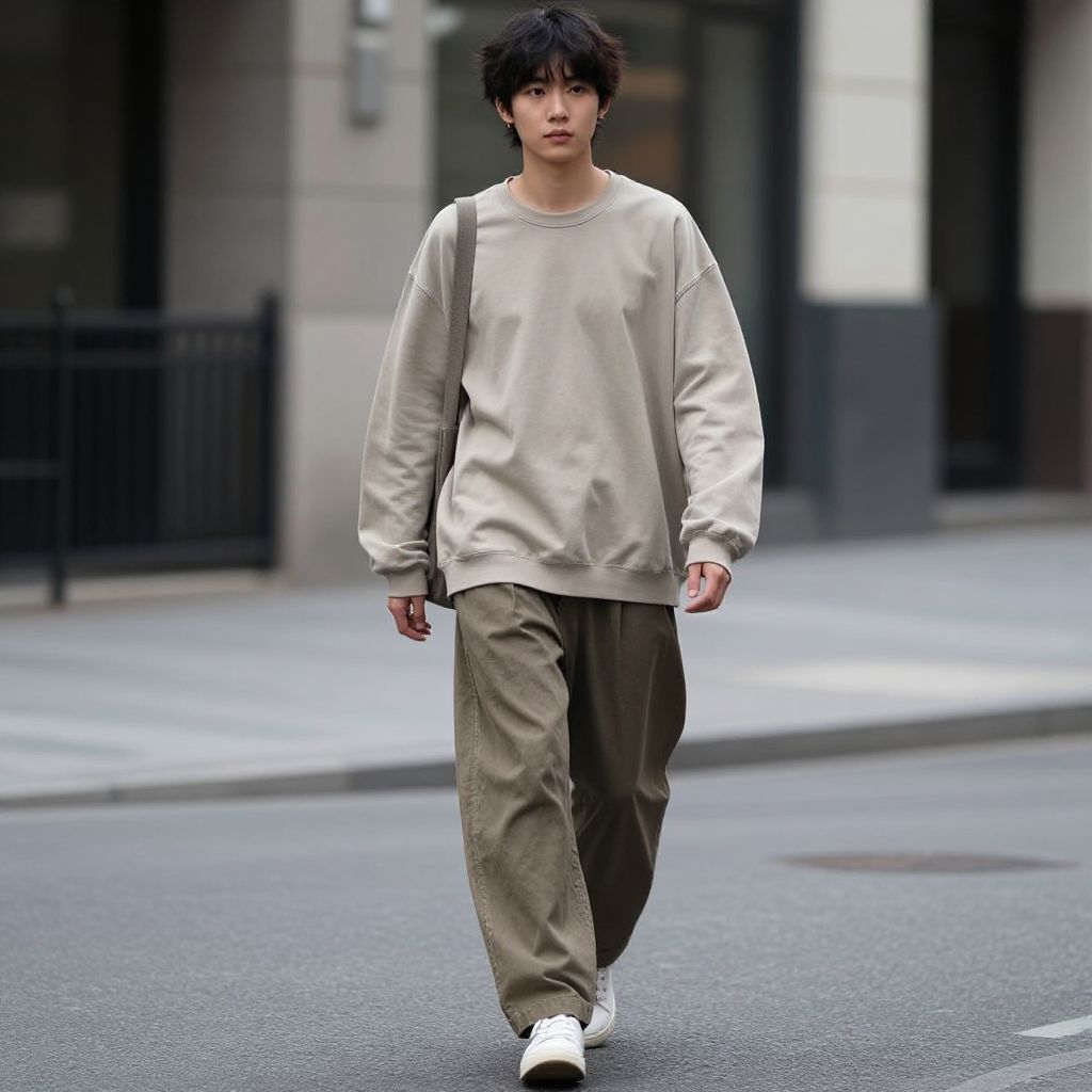 Photograph of an Asian man with short, dark, slightly messy hair, walking down a city street. He wears a loose, beige sweatshirt with subtle white stripes on the sleeves, and loose, olive-green pants. His white sneakers stand out against the gray pavement. The background features blurred urban architecture with dark windows and a black metal fence on the left. The man's expression is neutral, and he walks with a relaxed stride. The overall color palette is muted, with beige, olive-green, and gray tones dominating the image.